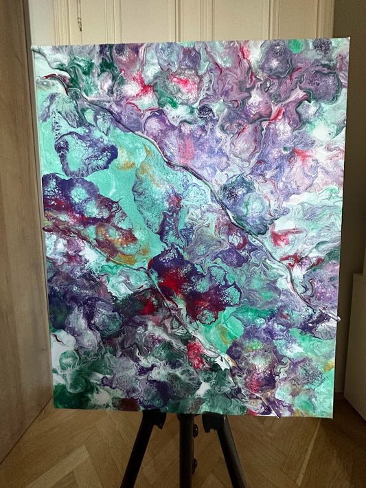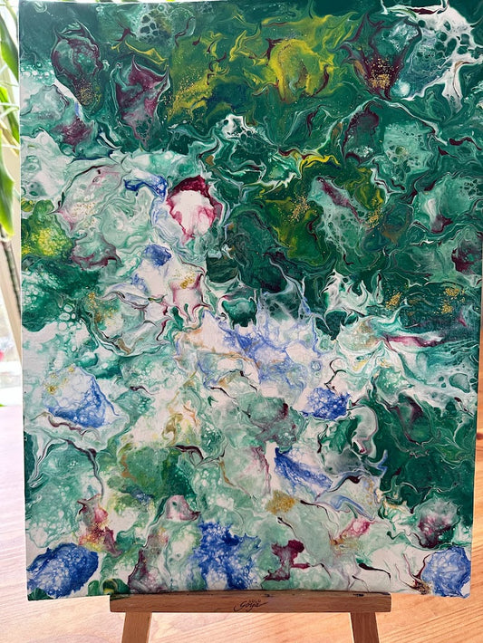 Summer Passion. Abstract flowers. Acrylic painting. Fluid art. Variety of green color together with blue, white, cherry color and a touch of gold decoration. Vanished. 30 x 40 sm.