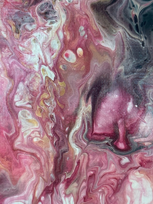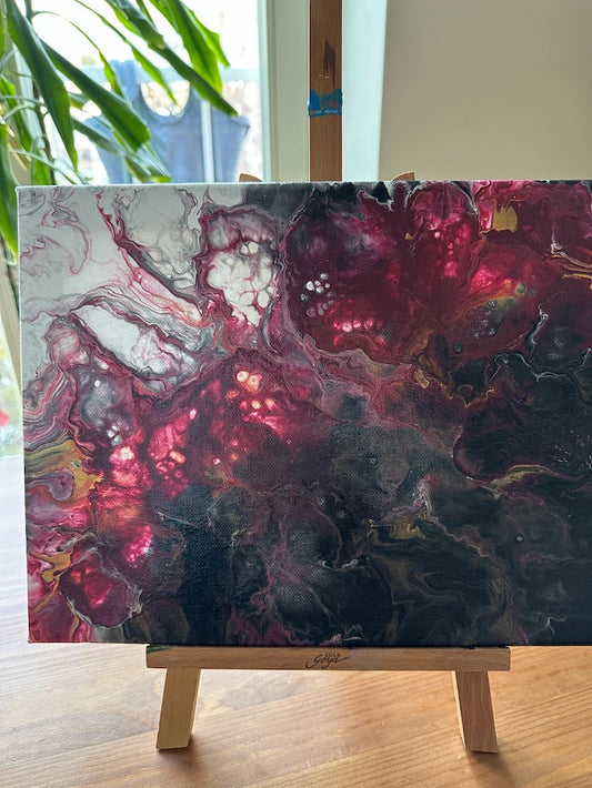 Roses.An Abstraction. Canvas. Acrylic painting. Fluid art. Black, white, dark red and rose colors. Vanished. 20 x 30 sm