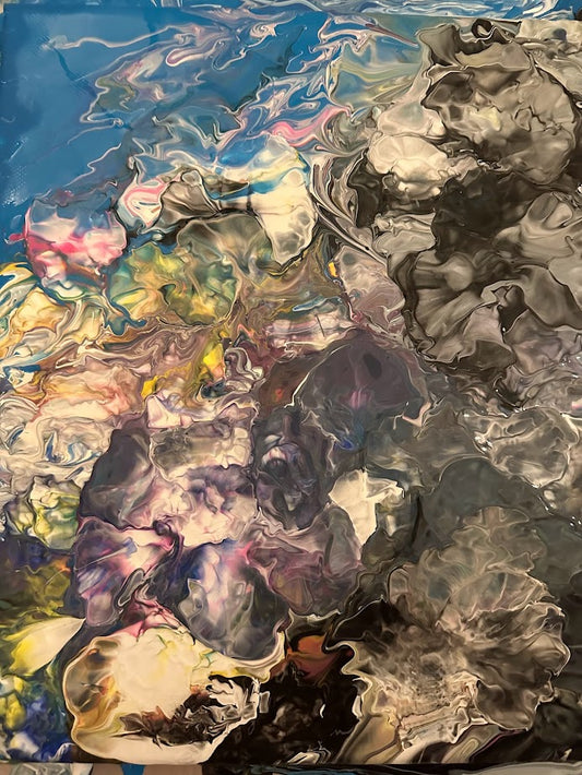 Warmth. Abstraction in blue, yellow, rose, white colors . Acrylic. Fluid Art. Canvas. 20sm x 30sm