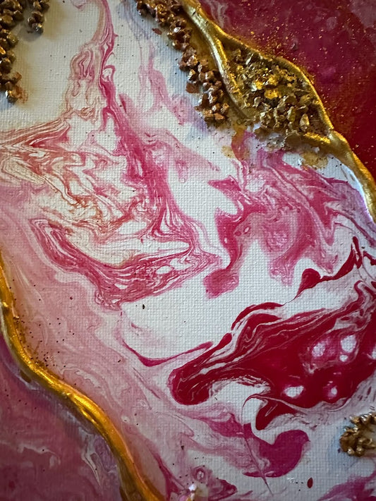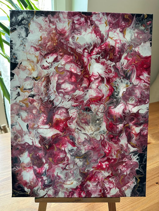 Roses passion. Acrylic painting. Fluid art. Canvas.Red, rose, white, black, gold colors. 30 x 40 sm.