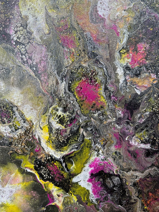 Abstraction: Black, Gold, and Rose. Acrylic painting. Fluid art. Decorative golden stripes. 30x40 sm